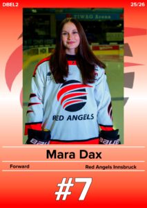 7 Mara Dax Lea GehrerMarlena Schöpf3. Kim Morawetz3. Victoria Schwaiger5. Tanja Knoll6. Magdalena Kusstatscher7. Mara Dax8. Erika Andrei9. Lia Schönberger10. Livia Gehrer10. Sarah Woschitz11. Julia Föger12. Marion Petritz14. Leonie Schwaiger15. Sarah Stock15. Lina Gabl18. Lena Klammer20. Barbara Zechberger21. Mona Korsitzky24. Laura Zingerle24. Lea Mair29. Magdalena Rossmann31. Louisa Wallner32. Anna Pichler33. Johanna Leonhartsberger39. Johanna Mühlegger41. Johanna Kusstatscher44. Lena Kappeller51. Denise Feuersinger53. Aliena Knappe55. Julia Volina55. Alexandra Kerschl57. Maria Senkowsky64. Chiara Egger67. Elisabeth Ragg72. Heike Schönherr77. Heidi Leitner79. Sofia Endrizzi87. Lena Schrottenbaum92. Amalia Reheis96. Leonie Sacher96. Hannah Leitner #7NameMara DaxNationalität ÖsterreichPositionStürmerAngel seit2022Aktuelle MannschaftRed Angels DEBL 2SaisonMannschaftToreAssistsPGesamt-