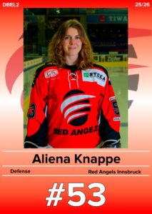 Aliena Knappe Magdalena RossmannAlexandra KerschlAliena KnappeHannah LeitnerHeidi LeitnerMagdalena KusstatscherLea GehrerSarah WoschitzVictoria SchwaigerMarlena SchöpfSofia Endrizzi3. Kim Morawetz5. Tanja Knoll7. Mara Dax8. Erika Andrei9. Lia Schönberger10. Livia Gehrer11. Julia Föger12. Marion Petritz14. Leonie Schwaiger15. Sarah Stock15. Lina Gabl18. Lena Klammer20. Barbara Zechberger21. Mona Korsitzky24. Laura Zingerle31. Louisa Wallner32. Anna Pichler33. Johanna Leonhartsberger39. Johanna Mühlegger41. Johanna Kusstatscher41. Lea Mair44. Lena Kappeller51. Denise Feuersinger57. Maria Senkowsky72. Heike Schönherr87. Lena Schrottenbaum92. Amalia Reheis #NameAliena KnappeNationalität DeutschlandPositionStürmerAngel seit2017Aktuelle MannschaftRed Angels DEBL 2SaisonMannschaftToreAssistsPGesamt-