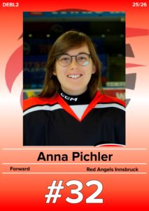 32 Anna Pichler Anna-Maria Schuh-PrantlVeronika GajdosikIrmgard BrandlhuberMichaela SvehlakLea PraschLea GehrerElla ScheumannVivien RanningerIda JensenPhilina MarinelliLeonie KreidlMarlena Schöpf3. Kim Morawetz3. Victoria Schwaiger5. Tanja Knoll6. Magdalena Kusstatscher7. Mara Dax8. Erika Andrei9. Lia Schönberger10. Livia Gehrer10. Sarah Woschitz11. Julia Föger12. Marion Petritz14. Leonie Schwaiger15. Sarah Stock15. Lina Gabl18. Lena Klammer20. Barbara Zechberger21. Mona Korsitzky22. Nicole Grubhofer24. Laura Zingerle24. Lea Mair27. Theresa Hölbling28. Elena Hubmann29. Magdalena Rossmann31. Louisa Wallner32. Anna Pichler33. Johanna Leonhartsberger39. Johanna Mühlegger41. Johanna Kusstatscher44. Lena Kappeller47. Magdalena Brandner50. Emma Weissensteiner51. Denise Feuersinger53. Aliena Knappe55. Julia Volina55. Julia Volina55. Alexandra Kerschl57. Maria Senkowsky64. Chiara Egger67. Elisabeth Ragg71. Melanie Jankovic72. Heike Schönherr75. Silvia Wild77. Heidi Leitner79. Sofia Endrizzi87. Lena Schrottenbaum92. Amalia Reheis96. Leonie Sacher96. Hannah Leitner #32NameAnna PichlerNationalität ÖsterreichPositionStürmerAngel seit2021Aktuelle MannschaftRed Angels DEBL 2SaisonMannschaftToreAssistsPGesamt- Rookie-CupSaisonMannschaftToreAssistsPGesamt- Tiroler Damen EishockeyligaSaisonMannschaftToreAssistsPGesamt-