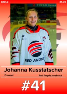 41 Johanna Kusstatscher Magdalena RossmannAlexandra KerschlAliena KnappeHannah LeitnerHeidi LeitnerMagdalena KusstatscherLea GehrerSarah WoschitzVictoria SchwaigerMarlena Schöpf3. Kim Morawetz5. Tanja Knoll7. Mara Dax8. Erika Andrei9. Lia Schönberger10. Livia Gehrer11. Julia Föger12. Marion Petritz14. Leonie Schwaiger15. Sarah Stock15. Lina Gabl18. Lena Klammer20. Barbara Zechberger21. Mona Korsitzky24. Laura Zingerle31. Louisa Wallner32. Anna Pichler33. Johanna Leonhartsberger39. Johanna Mühlegger41. Johanna Kusstatscher41. Lea Mair44. Lena Kappeller51. Denise Feuersinger55. Julia Volina55. Julia Volina57. Maria Senkowsky64. Chiara Egger67. Elisabeth Ragg72. Heike Schönherr87. Lena Schrottenbaum92. Amalia Reheis96. Leonie Sacher #41NameJohanna KusstatscherNationalität ItalienPositionStürmerAngel seit2019Aktuelle MannschaftRed Angels DEBL 2SaisonMannschaftToreAssistsPGesamt- DEBL 2 CupSaisonMannschaftToreAssistsPGesamt-