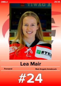 24 Lea Mair Marlena Schöpf3. Victoria Schwaiger5. Tanja Knoll6. Magdalena Kusstatscher7. Mara Dax8. Erika Andrei10. Sarah Woschitz11. Julia Föger14. Leonie Schwaiger15. Lina Gabl18. Lena Klammer20. Barbara Zechberger24. Lea Mair29. Magdalena Rossmann31. Louisa Wallner32. Anna Pichler39. Johanna Mühlegger41. Johanna Kusstatscher44. Lena Kappeller51. Denise Feuersinger53. Aliena Knappe55. Alexandra Kerschl57. Maria Senkowsky77. Heidi Leitner79. Sofia Endrizzi92. Amalia Reheis96. Hannah Leitner #24NameLea MairNationalität ItalienPositionVerteidigerAngel seit2025Aktuelle MannschaftRed Angels DEBL 2SaisonMannschaftToreAssistsPGesamt-