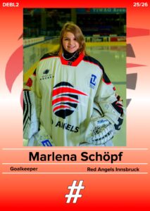 Marlena Schöpf Lea PraschElla ScheumannVivien RanningerPhilina MarinelliLeonie KreidlMarlena Schöpf3. Victoria Schwaiger5. Tanja Knoll6. Magdalena Kusstatscher7. Mara Dax8. Erika Andrei10. Sarah Woschitz11. Julia Föger14. Leonie Schwaiger15. Lina Gabl18. Lena Klammer20. Barbara Zechberger22. Nicole Grubhofer24. Lea Mair27. Theresa Hölbling28. Elena Hubmann29. Magdalena Rossmann31. Louisa Wallner32. Anna Pichler39. Johanna Mühlegger41. Johanna Kusstatscher44. Lena Kappeller47. Magdalena Brandner50. Emma Weissensteiner51. Denise Feuersinger53. Aliena Knappe55. Alexandra Kerschl57. Maria Senkowsky71. Melanie Jankovic75. Silvia Wild77. Heidi Leitner79. Sofia Endrizzi92. Amalia Reheis96. Hannah Leitner #NameMarlena SchöpfNationalität ÖsterreichPositionGoaliesAngel seit2025Aktuelle MannschaftRed Angels DEBL 2SaisonMannschaftToreAssistsPGesamt- Tiroler Damen EishockeyligaSaisonMannschaftToreAssistsPGesamt-