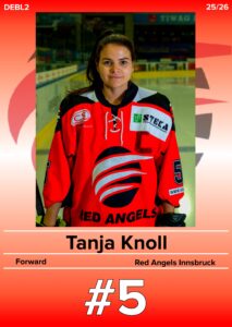 5 Tanja Knoll Lea GehrerMarlena Schöpf3. Kim Morawetz3. Victoria Schwaiger5. Tanja Knoll6. Magdalena Kusstatscher7. Mara Dax8. Erika Andrei9. Lia Schönberger10. Livia Gehrer10. Sarah Woschitz11. Julia Föger12. Marion Petritz14. Leonie Schwaiger15. Sarah Stock15. Lina Gabl18. Lena Klammer20. Barbara Zechberger21. Mona Korsitzky24. Laura Zingerle24. Lea Mair29. Magdalena Rossmann31. Louisa Wallner32. Anna Pichler33. Johanna Leonhartsberger39. Johanna Mühlegger41. Johanna Kusstatscher44. Lena Kappeller51. Denise Feuersinger53. Aliena Knappe55. Julia Volina55. Julia Volina55. Alexandra Kerschl57. Maria Senkowsky64. Chiara Egger67. Elisabeth Ragg72. Heike Schönherr77. Heidi Leitner79. Sofia Endrizzi87. Lena Schrottenbaum92. Amalia Reheis96. Leonie Sacher96. Hannah Leitner #5NameTanja KnollNationalität ÖsterreichPositionStürmerAngel seit2009Aktuelle MannschaftRed Angels DEBL 2SaisonMannschaftToreAssistsPGesamt- DEBL 2 CupSaisonMannschaftToreAssistsPGesamt-